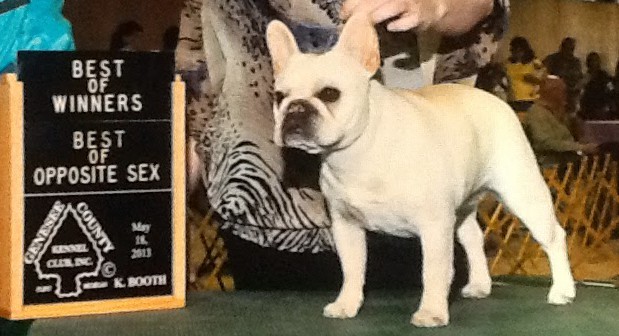 Parlez Vous’ New Beginnings at Valpo (Madge) is a sweet, cute, gentle girl. Madge is the iconic frenchie butt wiggler. When she came to our home at 8 weeks old, she ran up to our two Danes and just wiggled her butt at them. That has become her greeting to people and dogs when they enter our home. She also loves to run to all the other dogs and bark and wiggle her butt to announce breakfast or dinner is being served. She is quite the clown.